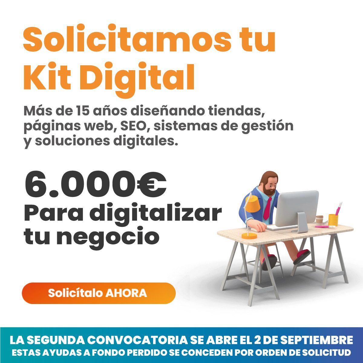 Las empresas de 3 a 9 empleados podrán solicitar el Kit Digital a partir del día 2 de septiembre a las 10:00AM. El Kit Digital es el programa de ayudas financiado por la Unión Europea a través de los fondos Next Generation EU para la digitalización de las pymes y autónomos de nuestro país.
